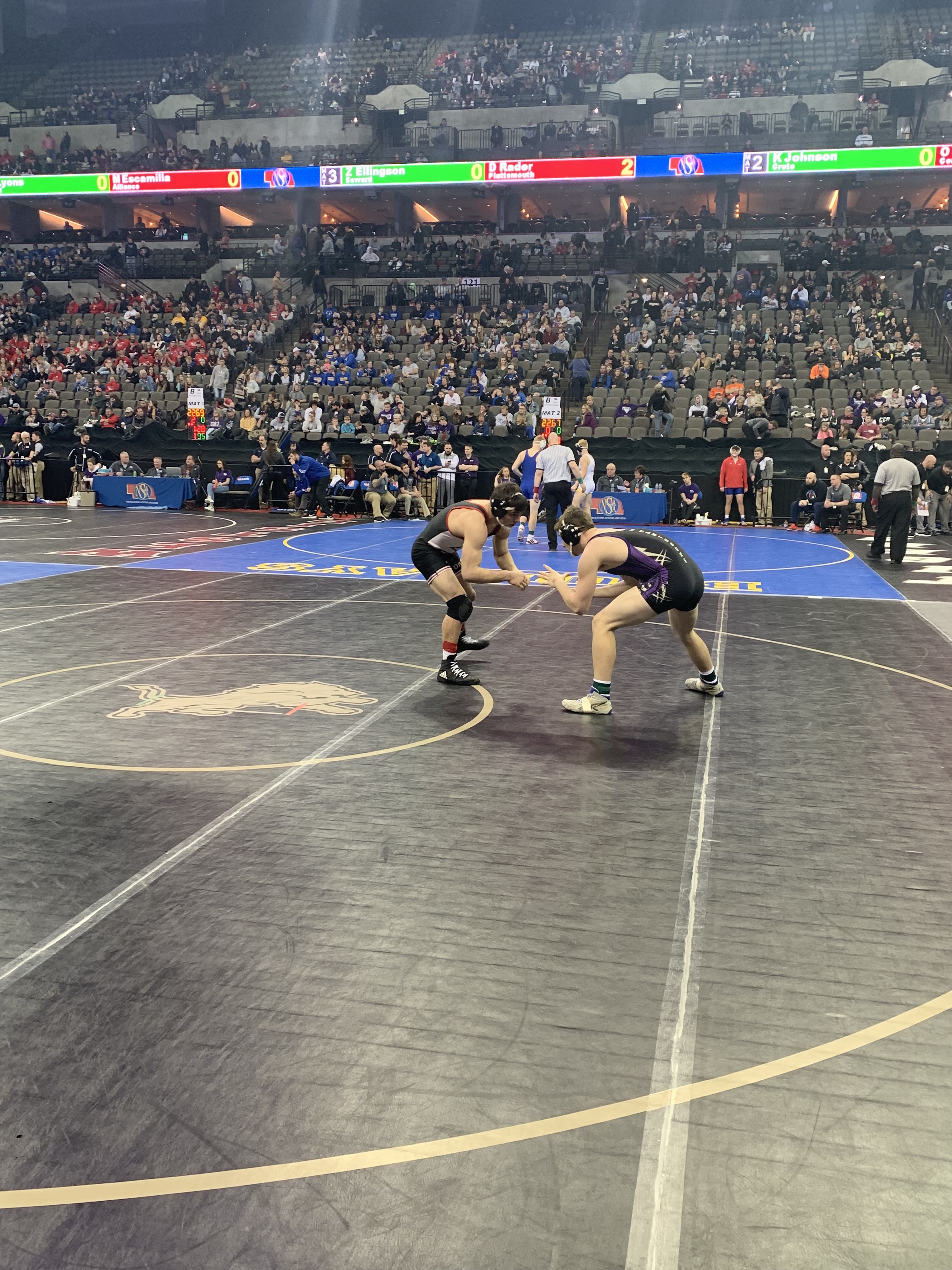 - Cons. Round 2 – Eric Hoesing (Hartington Cedar Catholic) 31-10 won by decision over Hunter Schwaninger (Lincoln Christian) 37-13 (Dec 7-1)